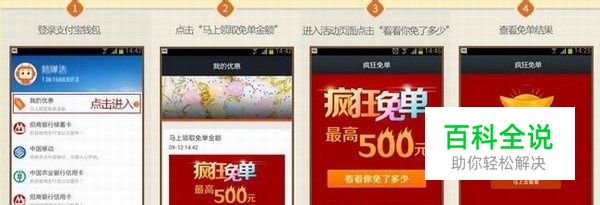 支付宝钱包部分免单活动受到很多朋友的关注,质疑的声音也是存在的,下面这篇文章就将为大家介绍免单活动的规则以及流程,一起来看看支付宝钱包免单活动登录领取教程吧~ 一、活动时间: 2013年9月13日~长期,领取免单仅限手机上操作,且要保证手机上网功能开通(活动为支付宝举办,请放心参加)。 1、收到阿里旺旺在线消息提醒或短信消息通知后,如何领取免单金额? 第一步、仅支持android和ios系统智能手机,登录的支付宝钱包(支持版本号7.1.0.0701版本及以上,未安装用户,阿里旺旺和短信中均提供下载链接或点此进入下载); 第二步、用购物的支付宝账户或淘宝账户登录支付宝钱包,查看【我的优惠】,点击【马上领取免单金额】(如下图所示);若未看到此信息,请确保网络畅通,并下拉更新一次;或换个手机登录尝试。 第三步、点击【看看你免了多少】,免单会以集分宝形式实时发放到您的支付宝账户。 2、为什么按照流程操作,未找到“我的优惠”(免单)入口? 1、此活动仅支持android和IOS系统智能手机用户,登录的支付宝钱包版本号必须在7.1.0.0701版本及以上。 2、请确保是收到信息(即购物的支付宝账户或淘宝账户)登录。 3、请您确保网络畅通,并下拉刷新一下手机钱包页面。 4、若还是不可以,请换个手机登录尝试。 二、活动内容: 仅限于收到活动通知的用户参与,通知方式:阿里旺旺在线消息提醒或短信消息;在活动期间首次登录支付宝钱包即可享受1-500元不定额免单,免单以集分宝形式返还。 三、活动规则: 免单金额以集分宝形式实时返还。每个用户只有一次中奖机会。 四、领取流程: 仅限收到通知的24小时内登录有效。 大家一定要注意在收到通知的24小时内登录支付宝领取,否则就作废咯~
