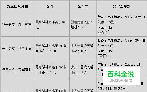 玩家进入相应的层次后,只有同时满足两个条件(详见下表),才能继续停留在该层次中,否则将进入下一个层次,直至达到最高层次。各个层次对于装备及幻兽等,均有不同的限制,详细的设置如下表所示:
