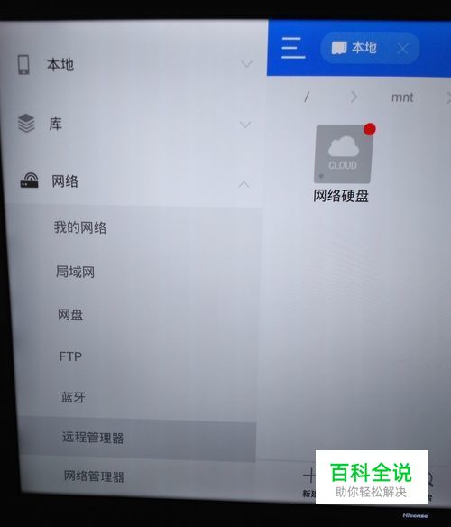 打开电视上的es进行设置 打开es找到左面菜单栏的网络项点击,往下拉找到远程管理器点击进入如图