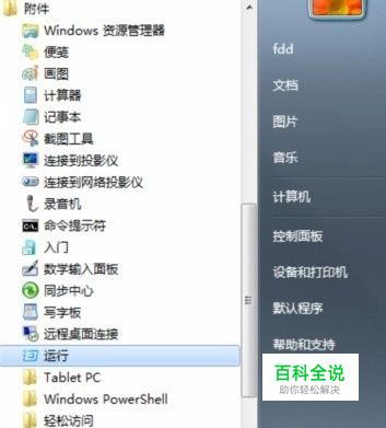 首先点击开始-附件-运行。