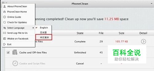 方法一:使用 PhoneClean垃圾清除器; 下载一个phoneclean软件,然后安装好,打开这个软件再点击左上角的菜单选择“Select Language--中文简体”,如图;
