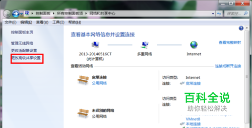 步骤二:【“共享”设置】 在桌面右下角打开“”,点击左侧“更改高级共享设置”。 把“网络发现”、“文件和打印机共享”、“公用文件夹共享”都设为启用。