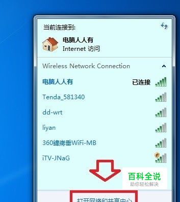 任务栏点击网络图标→打开网络和共享中心