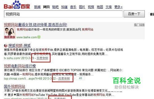 怎么找到百度快照?打开 www.baidu.com 输入你要查找的关键词,比如说视频网站。可以看到在红色方框表中的区域有百度快照的字样。鼠标单击百度快照就能打开浏览网页了, 百度快照的服务稳定,下载速度极快,您不会再受死链接或网络堵塞的影响。