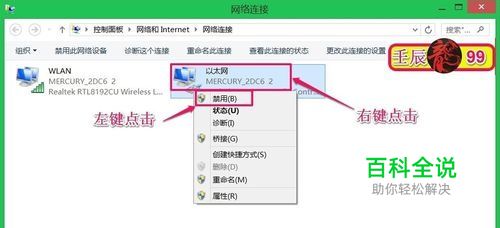 在网络连接窗口,右键点击:以太网,在右键菜单中左键点击:禁用(B);