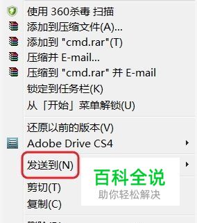 在上面图2中的“附件”的“命令提示符”图标上点击右键,在出现的菜单中选择“发送到(N)”。