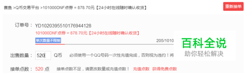 第二步:给买家充值点券。 今日有八七折回收Q币的买家,这个折扣可以说是比较高的了。买家需要卖家充值DNF点券,接单之后卖家按照买家的要求,输入要出售的Q币数量(不超过910个Q币),然后确认接单。把买家账号复制下来,然后到腾讯充值中心为买家充点券。