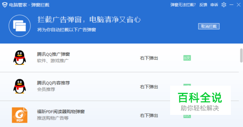 在软件弹窗拦截界面,选择要拦截的对象,若不知道白色区域来自什么软件,可以全部勾选。经过软件处理以后,稍等一会儿,白色区域就消失了。