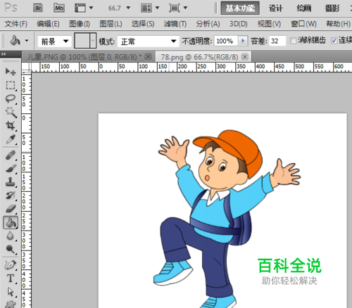 勾选选区,单击对话框里带有+号的滴管工具,在小孩的衣服上单击一下,这样就选中了颜色相同的衣服和鞋子区域。调整颜色容差,可以选中颜色相近的区域。系统就会对所选区域的颜色进行调整。