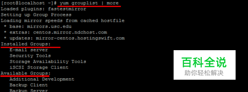 二、再次从上面分析的结果看到,当前运行级别是3,而且也没有安装桌面环境的软件。 然后我们使用命令查看一下桌面有哪些桌面环境的软件,然后装显示出来的软件组件就可以了。例如: [root@localhost ~]#[root@localhost ~]# yum grouplist | more Loaded plugins: fastestmirrorSetting up Group ProcessLoading mirror speeds from cached hostfile * base: mirrors.usc.edu * extras: centos.mirror.ndchost.com * updates: mirror-centos.hostingswift.com Installed Groups: E-mail server Security Tools Storage Availability Tools iSCSI Storage Client Available Groups: Additional Development Backup Client Backup Server Base CIFS file server Client management tools Compatibility libraries Console internet tools Debugging Tools Desktop Desktop Debugging and Performance Tools Desktop Platform Desktop Platform Development Development tools Dial-up Networking Support Directory Client Directory Server Eclipse Emacs FCoE Storage Client FTP server Fonts General Purpose Desktop Graphical Administration Tools Graphics Creation Tools Hardware monitoring utilities High Availability High Availability Management Identity Management Server Infiniband Support Input Methods Internet Applications Internet Browser Java Platform KDE Desktop Large Systems Performance Legacy UNIX compatibility Legacy X Window System compatibility Load Balancer Mainframe Access Messaging Client Support MySQL Database client MySQL Database server NFS file server Network Infrastructure Server Network Storage Server Network file system client Networking Tools Office Suite and Productivity PHP Support Performance Tools Perl Support PostgreSQL Database client PostgreSQL Database server Print Server Printing client Remote Desktop Clients Resilient Storage Ruby Support SNMP Support Scientific support Server Platform Server Platform Development Smart card support System Management System administration tools TeX support Technical Writing TurboGears application framework Virtualization Virtualization Client Virtualization Platform Virtualization Tools Web Server Web Servlet Engine Web-Based Enterprise Management X Window System Available Language Groups: Catalan Support [ca] Chhattisgarhi Support [hne] Chichewa Support [ny] Chinese Support [zh] Coptic Support [cop] Croatian Support [hr] Czech Support [cs] Danish Support [da] Dutch Support [nl] English (UK) Support [en_GB] Esperanto Support [eo] Telugu Support [te] Tetum Support [tet] Zulu Support [zu] Done =========================================== 从上面的软件组信息,挑选与桌面环境有关的软件组,然后安装即可,我下面选择的软件组与输入法还有字体等桌面环境需要用到的供大家参考一下。 yum groupinstall -y "Desktop" "Desktop Platform" "Desktop Platform Development" "Fonts" "General Purpose Desktop" "Graphical Administration Tools" "Graphics Creation Tools" "Input Methods" "X Window System" "Chinese Support [zh]" "Internet Browser" 后面的是安装软件过程,需要等等一阵时间。