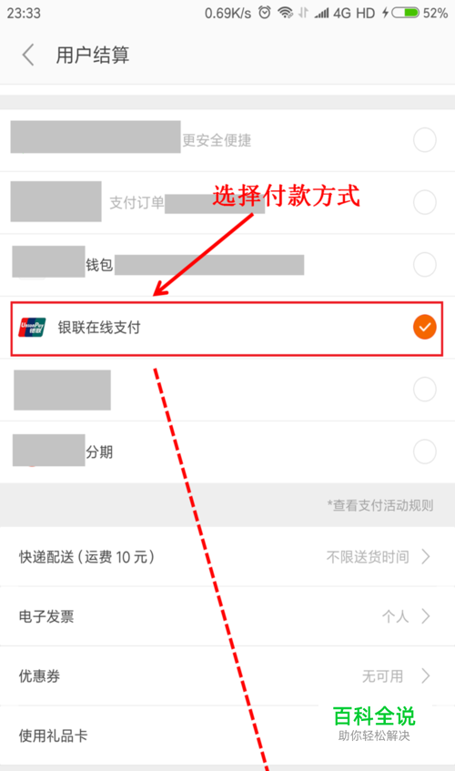 在确认收货地址无误后,付款方式里边选择“银联在线支付”,再点击【去付款】。