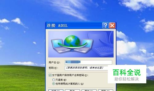 宽带创建完成了,当然就要试一试创建是否成功了,在桌面双击“宽带连接”图标,弹出一个连接窗口,如果之前输入了用户名与密码,这里就不需要输入了,直接点“连接”即可,如果未输入,就要输入用户名与密码。 还有第2,3项,之前在第九步勾选了,就无需勾选,如果没勾选,在这里,就需要设置一次。 如果连接成功,就会在任务栏通知区域上显示双电脑图标,还会有一个气泡提示“宽带连接(ADSL) 现在已连接”。