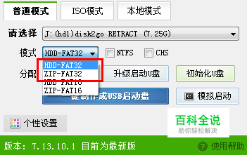根据主板的“新旧”程度来选择“USB_HDD”和“USB_ZIP”两种模式中的一种。 通过情况下,针对老式主板,大都会选择“USB_ZIP”模式,因此该模式兼容性好,且生成的盘符为A盘,比较适合老主板。