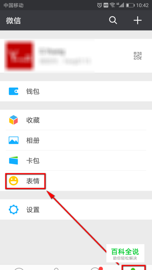 首先打开微信,在微信“我”页面的列表中点击选择【表情】,如图所示。