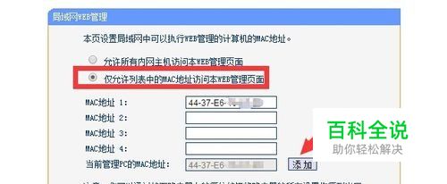 从打开的“局域网WEB管理”界面中,勾选“仅允许列表中的MAC地址访问本WEB管理页面”项,点击“当前管理PC的MAC地址”右侧的“添加”按钮,再点击“保存”按钮即可。