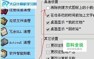 以上为隐藏,下面再介绍其他方法: ②:取消快捷方式图标上的箭头 只需要在 HKEY_CURRENT_USER/Software/Microsoft/Windows/CurrentVersion/Explorer,里面新建2进制值Link,并修改为00 00 00 00就可以实现了。 ③:把快捷方式的小箭头更改为其它图标 HKEY_LOCAL_MACHINE/Software/Microsoft/Windows/ CurrentVersion/explorer/Shell Icons 新建或修改字符串"29",设置其值为你的图标路径。 二:使用软件清除快捷方式小箭头! 本例使用优化大师来完成! 打开优化大师,选择“系统个性设置”,在其对应的右边的设置里面,找到“消除快捷方式图标上方的小箭头”,将其前面的勾去掉即可!