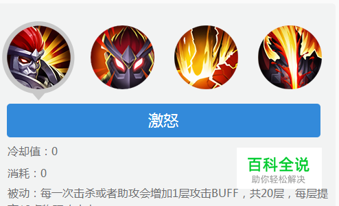 首先是典韦的被动技能为“激怒”(详见下方图片内),每一次击杀或者助攻会增加1层攻击BUFF,共20层,每层提高12点物理攻击力。