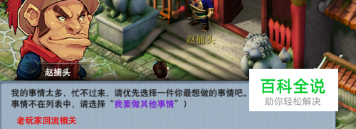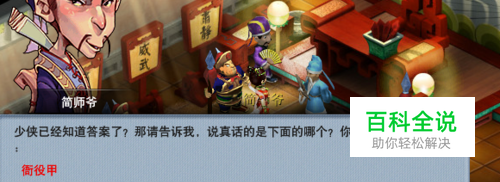首先用飞行符飞到建邺城找赵捕头,领取任务后先去衙门里面做个小小的考验,先点建邺县令,然后问旁边的师爷,再问旁边的衙役,最后就是回答师爷的问题:谁说的才是真话?答案就是--衙役丁。做完了考验再回到赵捕头那里领令牌,有了令牌之后去查案。