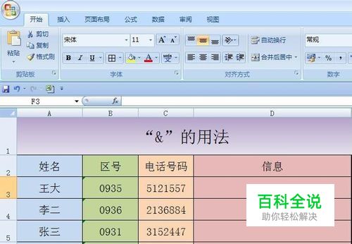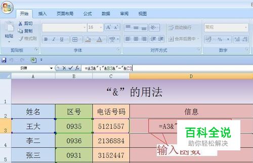 在D3单元格中输入=A3&":"&B3&"-"&C3,其中A3、B3、C3分别代表姓名,区号,电话号码,":"和"-"是为了美观加入的两个符号,输完后回车,在D3中变成了(王大:0935-5121557)。
