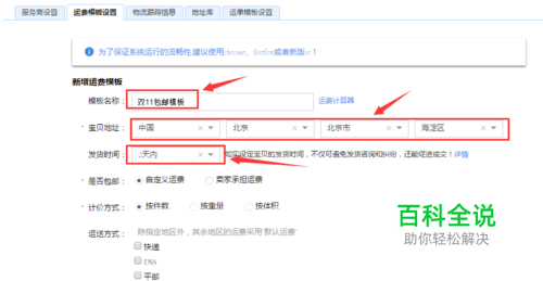 设置运费模板的名称,方便后续的管理使用;选择宝贝地址,注意,这里是宝贝地址,既宝贝的所在地;设置发货时间,一般天猫店铺建议为24小,淘宝店铺可以设置到48小时或者72小时;特殊定制商品等,根据实际情况设置发货时间。