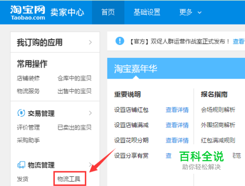 登录淘宝/天猫卖家账号,并进入卖家中心。在左侧导航栏找到【物流管理】里面的【物流工具】选项,点击进入物流工具页面。