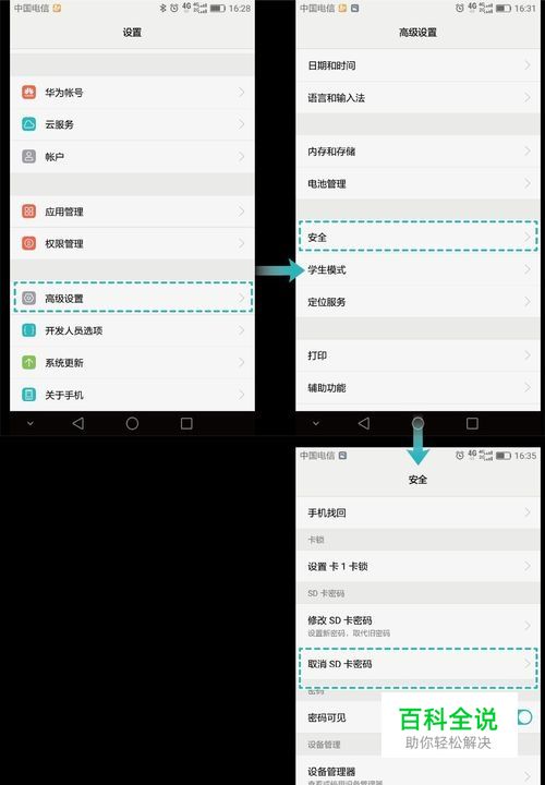 l 如果在其他支持microSD卡加密的华--为手机上,您可以进入【设置】>【高级设置】>【安全】>【解锁SD卡】/【强制清除SD卡密码】。如您选择【强制清除SD卡密码】,microSD卡数据会被清除且无法恢复。