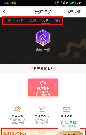 第七步我们也可以看到一下爵位的升级说明,从子爵到侯爵可以通过送礼物积累财富值获得,也可以直接在电脑端购买获得,爵位要升级到公爵和国王,必须要用Y币购买,如下图所示: