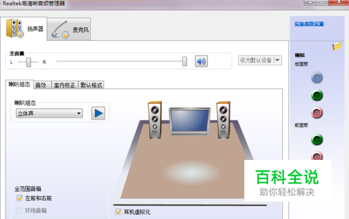 第六步:扬声器的调试 在扬声器页面,可以选择音响所处环境和所需声道,避免音响因环境带来的散音、破音等(按实际环境调节可以带给自己更完美的体验)