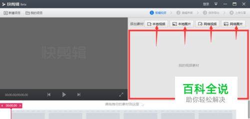 双击打开快剪辑,首先添加素材,素材分为两种,一类是视频,一类是图片,可以打开素材存放位置直接拖拽至视频素材区域,也可以如图所示,点击上传本地或网络视频/图片。