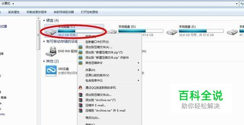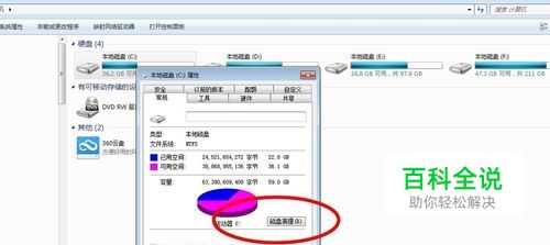右键单击c盘→属性。