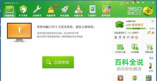 点击后直接进入360卫士电脑体检窗口,我们点击右边的功能大全下面有一个U盘鉴定器的图标,如果没有下载过的话,会直接进入下载安装过程,这里我已经下载了;