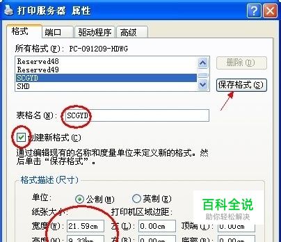 2、创建并且保存自定义的纸张 在“服务器属性”中,勾选“创建新格式”。 在“表格名”中为自己新定义的纸张起一个名字,建议以英文和数字命名。本文以“SHGYD”为例。 选择使用单位:“公制”以厘米为单位。 在“宽度”、“高度”中输入自定义纸张的大小(连续纸的高度是指两个撕纸位之间的长度)。本文以21.59cm宽、9.33cm高的纸张为例。 打印机区域边距根据需要自行制定。 最后点击“保存”。 一个名叫“SHGYD”的格式就生成了。其代表宽度21.59cm、高度9.33cm的纸张大小。如图。