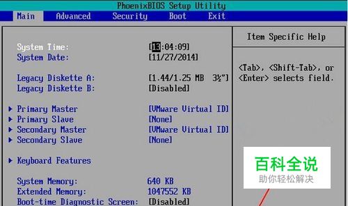 进入bios界面设置,在该界面我们要进行几个重要的操作,所以我们要了解界面底部注明:键盘上的方向键进行光标移动;回车键表示“确定”;F10表示“保存并退出“。