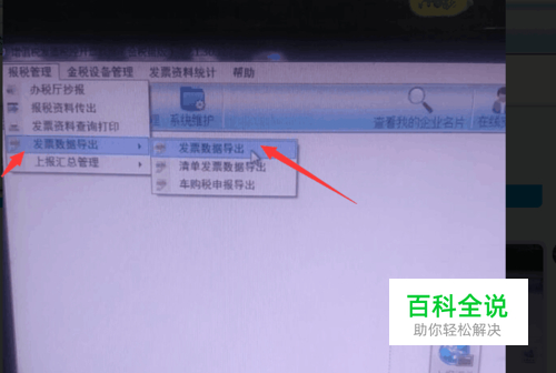 一般我们会想到发票数据导出去属于发票管理的范畴,其实属于报税管理的范畴,点击左上角的报税管理,会出现下拉项目----选择发票数据导出-----继续选择发票数据导出,如下图