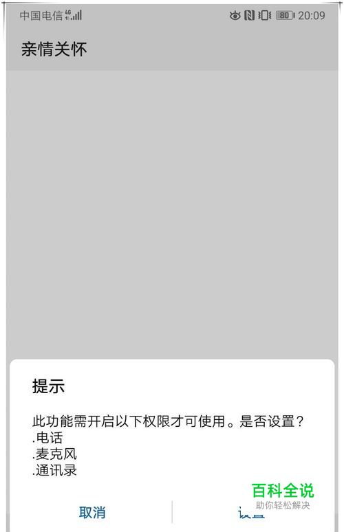 打开亲情关怀,会提示需要电话、麦克风、通讯录等权限,点击设置,将相关权限开关打开。