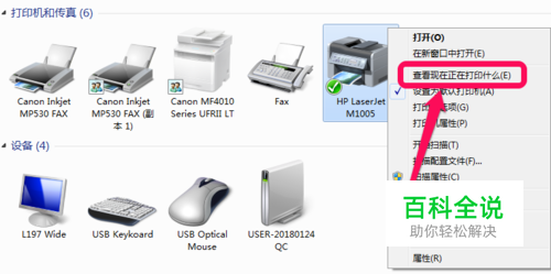 在弹出的页面中选择打印机,鼠标右键点击,选择【查看现在正在打印什么】