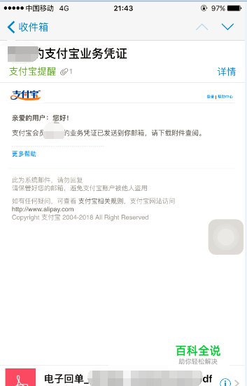 进入邮箱的收件箱,找到支付宝的提醒,进入之后,找到附件电子回单,下载后打开就是咯~
