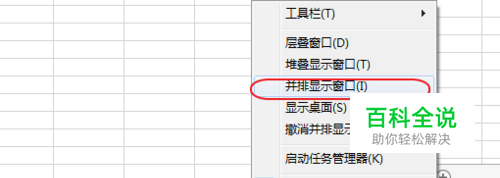 将两个电子表格任意形式排列在桌面上,鼠标右击任务栏,在弹出菜单中选择“并排显示窗口”即可。