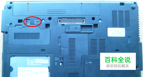 拆掉笔记本的电池。 在笔记本的背面找到如图所示的地方:在红圈标注的地方往左推,然后把电池按照图中的箭头推动,就可以把电池拿下来。