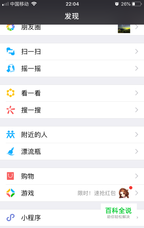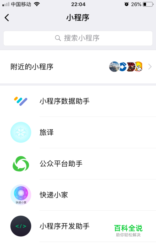 进入到微信界面之后,点击发现,选择最下面的小程序入口,进入到小程序搜索界面,如下: