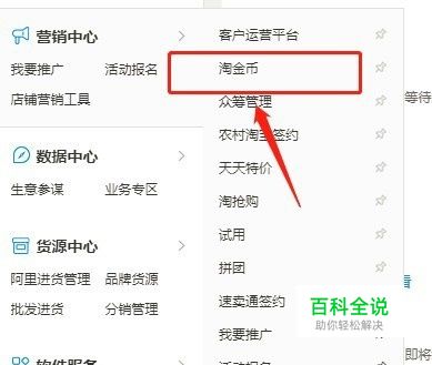 点击营销中心的菜单栏,如下图所示,找到淘金币入口点击进入。