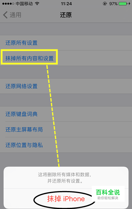 这个方法必须先需要抹掉iPhone设备上的数据,打开手机,点击“设置”→“通用”→“还原”→“抹掉所有内容和设置”。