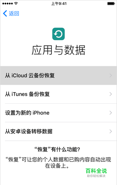 抹掉iPhone后,重新打开手机,按照提示,进入到恢复界面。看到“应用与数据”界面,然后点击“从 iCloud 云备份恢复”输入iCloud的ID和密码。然后根据备份数据的时间,选择恢复数据。iCloud恢复时间比较漫长,耐心等待恢复完成就可使用手机。