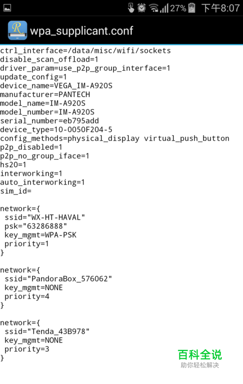 打开/data/misc/wifi路径,找到wps-supplicant.conf文件,长按选择以文本格式查看,你就能看到密码了,(如图)
