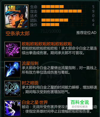 空条承太郎(简称:脏太。)是一个本身就很肉的英雄。可以从属性图中看的出来。加上他的被动,简直就是个就算不怎么肉基本也不会怎么被秒的角色。操作难度为中。主要是打打中期和前期的角色。后期配合R和队友基本上也是相当不错的角色。那么现在我们进入技能说明吧。 被动技能,恩,该怎么说呢,一看就是个欠揍的技能,你揍的爽,当然不是免费的,这是要还的。加攻击速度和闪避。后期这个被动起到很大的作用,当然这跟出装有关。附带助攻或者杀敌增加怒气70/30点。 Q技能,欧拉欧拉欧拉!看过动漫或者漫画的都知道,这才是空条的大招!1.5秒打出15次伤害。配合大招可以增加伤害系数。我们前期为了要让Q全部击中可以QW来做到。第一个点满。除非你想R完A人就可以不选择Q点满。 W技能,空条命令白金向前方打出一指,并且眩晕敌人0.2秒(未改的时候是0.5秒,0.5秒的时候可以QW基本全中,现在的话只能中一半。如果他没位移的情况也差不多全中。)伤害也蛮高的适合第二个点满。 E技能,一个闪现位移技能,比起闪现短了一点。可是重要的一点却是E后有个3秒的BUFF,就是敌人攻击你几次可以得到多少次的10怒气。Q的冷却时间为1秒,基本对面小兵多的话可以做到EQWQ然后走一步在Q或者EQWRQ,Q。当然这需要你多练习才能做到的。 R技能,对敌人施放时间停止2秒,没有任何伤害,但是对欧拉欧拉伤害+百分之30,满级后是百分之70。被动是敌人攻击你的时候也会被你时间停止0.5秒(未改前是1秒,那时候可以在敌人碰到你的时候你回头一个Q欧拉他然后W基本上欧拉打完前期他就要哭了。这时你本身还剩30怒气,A走,A走,ARAQ直接带走。当然现在不可以了。)