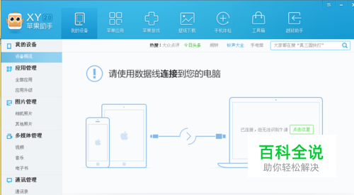 把你的苹果手机连接电脑,然后打开xy软件,然后点击连接,这时候会弹出 需要下载itunes 你直接点击下载就行,下载完的软件桌面式这个样子的