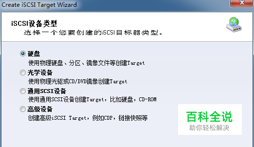 选择设备类型“硬盘”,iSCSI可以帮助我们实现在网络中分享多种设备资源,比如说iSCSI盘,光驱等等。