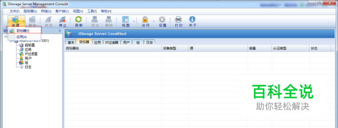 打开iStorage Server管理端,然后点击工具栏的创建,会出现“目标器”和“应用”两个选项,选择“目标器”也就是我们常说的iSCSI Target。