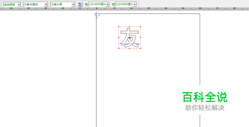 加边完成后,改用左上方的“选择”工具按钮 ,然后将排好的“友”字选定,因为只有选定,才能进行下一步的操作,不然无法进行拖动操作,选定后友字会出现红框,而且上面的字和下面的底各有红框;
