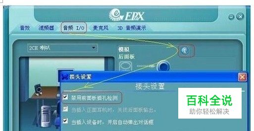 别着急,以常见的“RealtekHD系列板载声卡”为例,打开控制面板中的“Realtek高清晰音频设置”(点开始菜单->设置->控制面板->Realtek高清晰音频设置),单击“音频I/O”选项,点“小扳手”的图标,勾选“禁用前面板插孔检测”,点“OK”后退出就可以了。